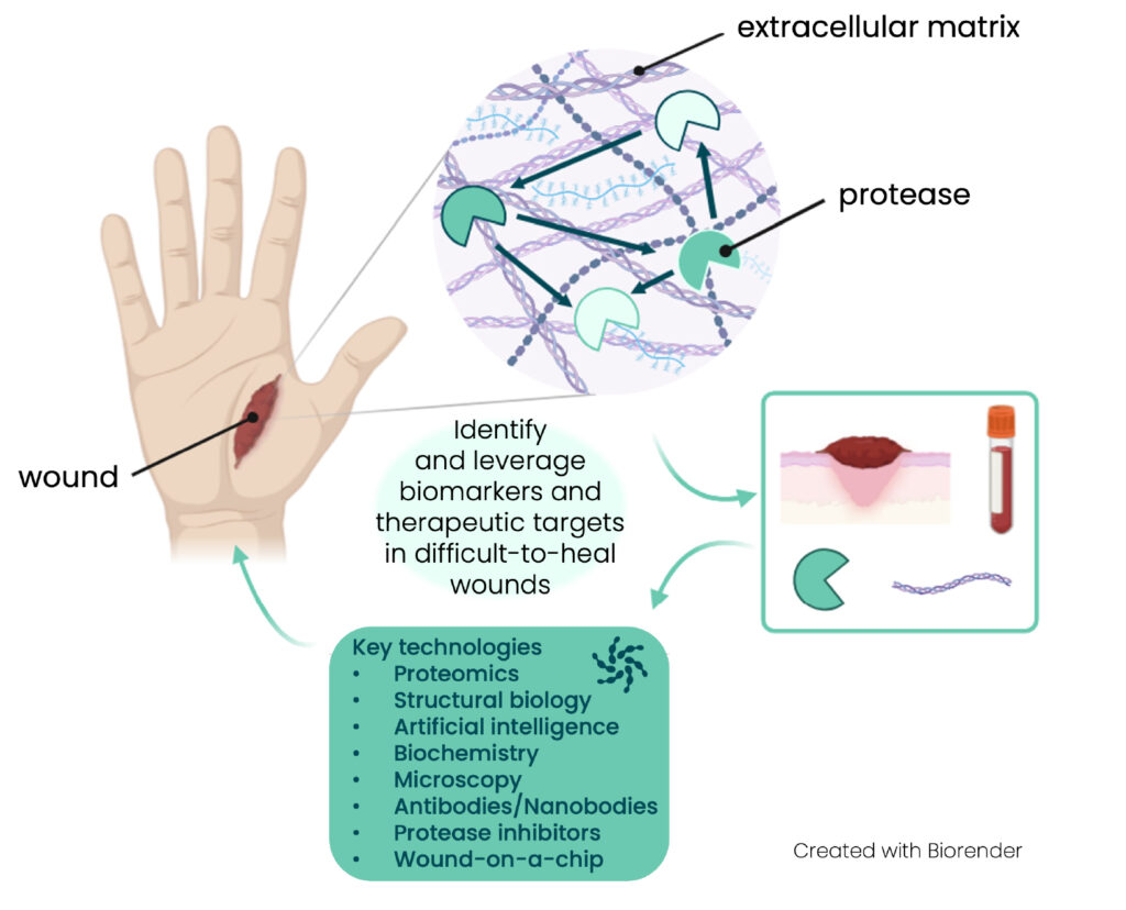 Doctoral candidates (DCs) 2, 3a, 3b and 4 will study different types of clinical samples and relevant mouse models, previously developed by consortium partners. They will focus on a selection of representative sample types corresponding to acute wounds (snake bites, surgery wounds), chronic wounds (venous leg ulcers, epidermolysis bullosa (EB) wounds), dermonecrotic wounds (snake bites) and fibrotic wounds (advanced stages of EB and dermonecrotic wounds). Besides tissue histology and targeted immuno-assays, proteolytic networks will be revealed through high-end proteomic approaches, including extensive analysis of protein neo-N-termini and computational approaches to connect proteases with their extracellular matrix substrates (DC-3b, DC-4). Mouse models and 3D organotypic skin cultures will also be used to analyse already-identified relevant protease targets and validate the new targets that will emerge from the proteomic data (DC-2, DC-3a).